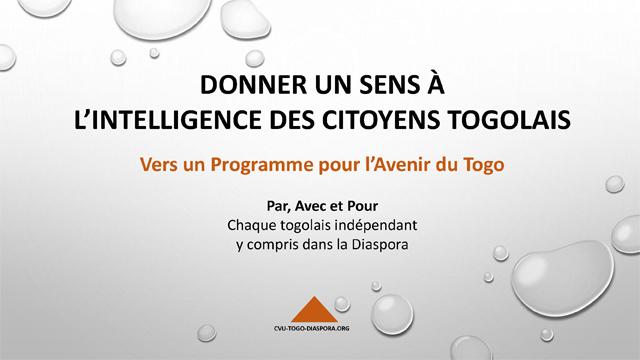 Aussi, le RCDTI et le CVU-TOGO-DIASPORA proposent un regroupement de ceux qui souhaitent une alternative au Togo. Cette alternative doit passer par un programme commun, dont les bases peuvent être trouvées avec le programme pour l’Avenir du Togo. Mais ce programme n’est pas conçu comme un programme « clé en main » mais bien fondée sur une démarche décentralisée et doit permettre l’expression d’une démocratie participative.
