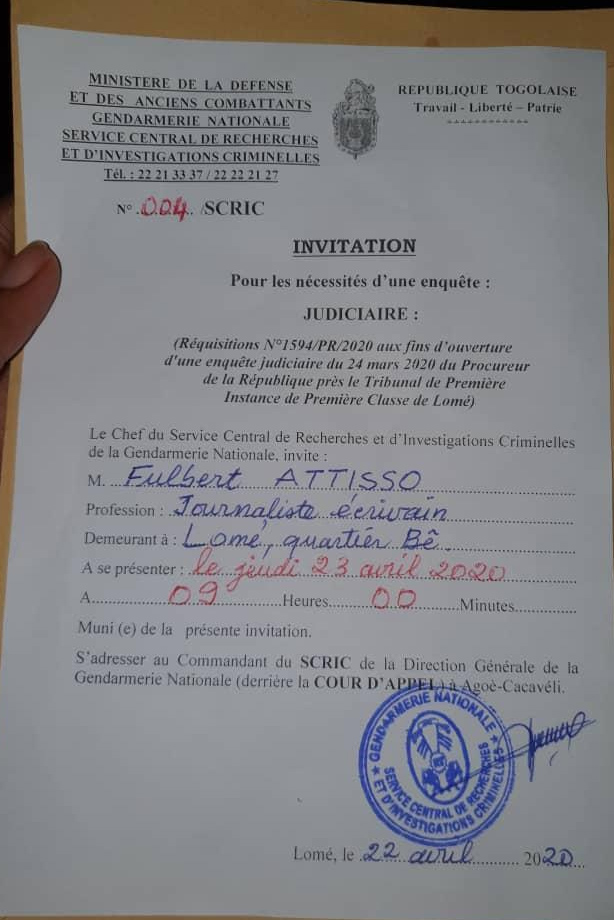 Accueil SOCIÉTÉ JUSTICE Dossier Agbéyomé : Fulbert Attisso et Mme Adjamagbo Johnson convoqués au SCRIC... Dossier Agbéyomé : Fulbert Attisso et Mme Adjamagbo Johnson convoqués au SCRIC le 23 avril 2020 22 avril 2020 2065 Partager Facebook Twitter Pinterest WhatsApp Linkedin Telegram Viber Le Coordinateur Général de la dynamique Mgr KPODJRO, Mr Fulbert Sassou ATTISSO, président du parti Le Togo Autrement , et Mme Kafui Adjamagbo-Johnson viennent à leur tour d’être convoqués au SRI demain jeudi 23 avril 2020. ARTICLES LIÉSPLUS DE L'AUTEUR Togo/Incendies au marché de Hanoukopé : A défaut d’enquêtes de la police, la piste spirituelle évoquée Togo/Destruction suivie de vente d’immeuble au quartier Avenou : Les auteurs ont désormais des visages Les navires et personnes impliqués dans les actes de piraterie maritime désormais poursuivis au Togo LAISSER UNE RÉPONSE Supprimer la reponseLog in to leave a comment FAITS DIVERS Togo : une fille d’Agbéyomé Kodjo victime d’agression et cambriolage, des coups... 27 juin 2022 Togo : Un corps repêché dans la lagune de Nyékonakpoè ce matin 22 juin 2022 Togo/Grave accident à Lomé ce lundi : un conducteur ramasse tout aux... 7 juin 2022 Togo/un Tchadien tue un gendarme à coup de couteau ; voici la... 3 juin 2022