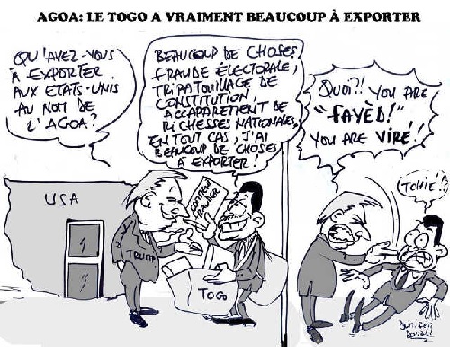 Les gens sont trop mauvais quoi. « Faure-vi » ne fait rien, ils crient ; il essaie de faire quelque chose pour se rendre utile aux autres – au moins ça -, ils crient encore au scandale. On a surpris dans un coin des « zopposants » en train de pester : qu’est-ce que le Togo a à exporter au point de se donner la peine d’abriter ce forum ? En voyant leurs gesticulations, on souriait seulement et se disait que ces gens sont trop ignorants quoi. Pour votre gouverne, l’ « Agoè », entendez l’Agoa, est une loi votée en 2000 sous le « prégodent » yankee qui aime trop femme là – cherchez et vous trouverez –, loi qui permet à certains produits fabriqués sur le continent obscur comme le magasin de la demeure de Lucifer, d’être exonérés de taxes à leur exportation et arrivée sur le territoire américain.