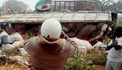 Ces revendeuses qui se rendaient à Bombouaka pour leur commerce étaient assises sur leurs marchandises dans le camion lorsqu’un de ses pneus éclata.