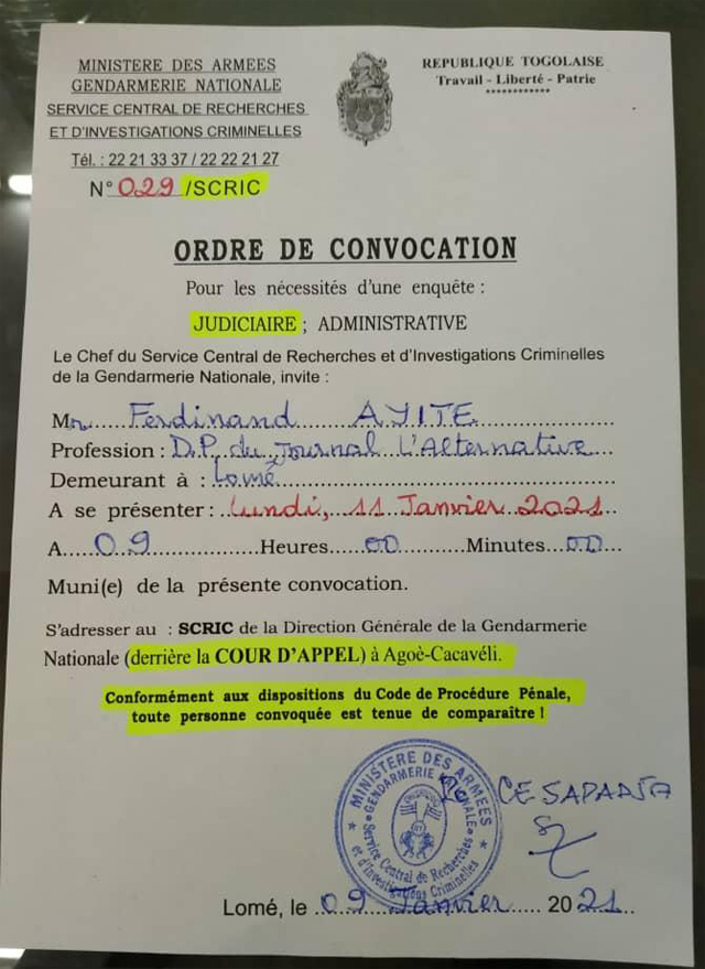 @togoactualite.com – Le Directeur de publication du journal « L’alternative », Ferdinand Ayité est convoqué au Service Central de Recherches et d’Investigations Criminelles (SCRIC), le lundi prochain 11 janvier à 9H00.