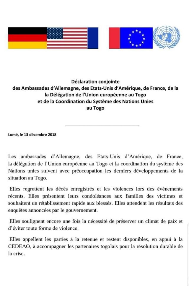 Déclaration conjointe des Ambassades d’Allemagne, des Etats-Unis d’Amérique, de France, de la Délégation de l’Union Européenne au Togo et de la Coordination du Système des Nations Unies au Togo